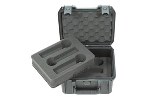 The 3i-0907-MC6 holds six mics in a very compact case and is part of the 3i Waterproof Series of cases. It allows 6 mics to be stored horizontally on two separate layers of foam (3 on top and 3 on bottom). Each microphone cutout measures 1.5" wide by 6.75" long with two perforated removable foam pieces, one located on each end allowing microphone sizes up to 8.5" in length. By removing the perforated foam piece near the grill of the microphone you can change the shape from being round to square. This will accommodate other popular hand held microphones with square style grills such as the Sennheiser and Electro Voice mics. The 3i-0907-MC6 case measures 9" x 7" x 6" deep and is the most compact 6-mic case on the market. The case has convoluted foam in the lid for a compression fit and is covered by SKB's Lifetime Warranty.